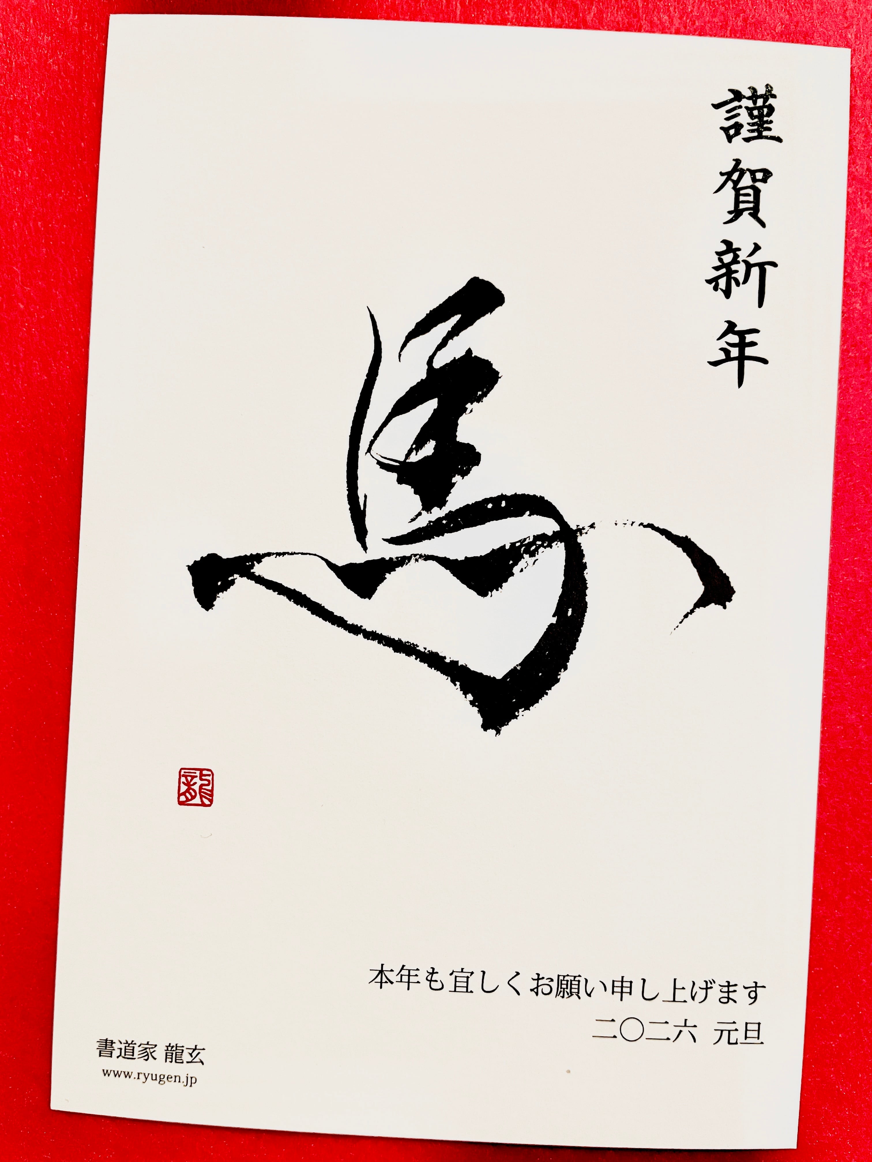 2026年の干支である『馬』の書を印刷した年賀状です。